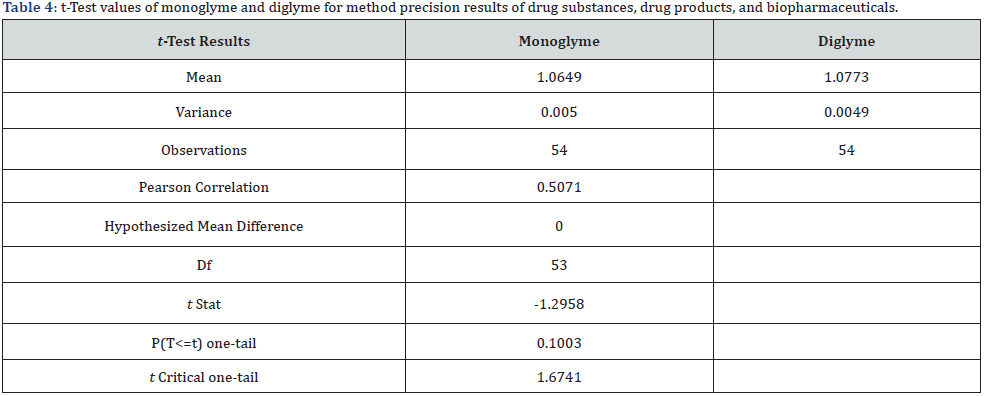 Method precision was determined using the tolerance sample solution. The %RSD was determined for monoglyme and diglyme content by injecting the spiked tolerance sample six times. The %RSD for monoglyme and diglyme was less than 0.5% that is well within the acceptance criterion of 5.0% [16,17]. The intermediate precision was analyzed by a different analyst using columns of a different lot number, different instrument, and on a different day. The %RSD of monoglyme and diglyme content was less than 4% and met the acceptance criterion of not more than 5.0% [16,17]. The data obtained are tabulated in (Table 3). These findings show that the method is precise for the instrument concerned. A t-test was performed to analyze the method precision and intermediate precision results of drug substances of saxagliptin, memantine, and etravirine, drug products of saxagliptin tablets (Onglyza®), memantine tablets (Menata®), etravirine tablets (Intelence®), and biopharmaceuticals Pegaspargase Injection (Hamsyl®), PEGinterferon Injection (PegiHep120®), and Pegfilgastim Injection (Pegasta®). The t-stat value was either greater than +2.0 or less than -2.0 is acceptable, indicating that the values (Table 4) are statistically significant with sufficiently strong evidence.