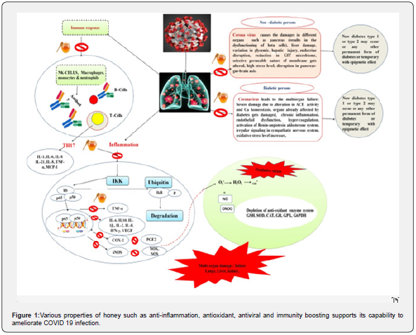 Honey possesses various biologically important properties such as antiviral, anti-inflammatory, anti-oxidative, immune booster, antiviral, anti-diabetic, antimicrobial, anti-proliferative, cardiovascular, neurological, and gastrointestinal diseases and anti-metastatic properties, anti-inflammation, antioxidant and immune boosting. Honey used as home nutritional supplement and can be used to boost the immune system under critical care conditions in patient. Honey decreases oxidative stress, inflammation, viral infections, might be used against the COVID-19 pandemic respiratory infection. Previous findings, in addition to the present summarized, provide great support towards the rationale of honey for the treatment against viral diseases. Further, various properties of honey such as antiinflammation, antioxidant, antiviral and immunity boosting supports its capability to ameliorate COVID 19 infection (Figure 1). Various research findings reported the use of honey against the viral infection and would also be effective against the COVID 19 infected patients. However, further experimental studies are required to validate these speculations.