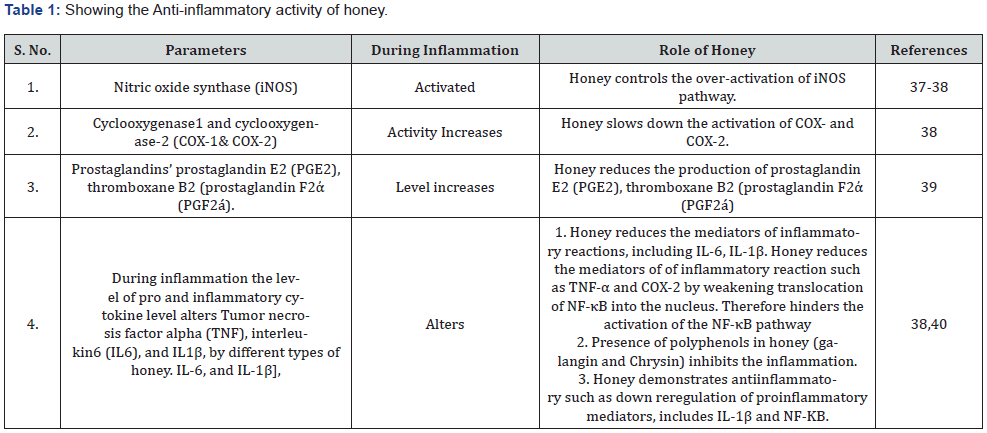 A number of investigators have reported that honey may function as an immune modulator having pro-inflammatory as well as anti-inflammatory properties, because honey stimulates or inhibit the secretion of various factors like cytokines, ROS, and MMP-9. Some major components of honey such as flavonoids may be having inhibitory action on cytokine production. Inhibition of inflammatory mediator reactions is one of the major steps in inflammation control. During healing stage of infection honey enhances the secretion of proinflammatory cytokines. In contrast to the above statement under controlled inflammation, honey helps to reduce the elevated levels of proinflammatory cytokines. During severe swelling, NF-kB activates and controls the transcription of IL-1b, IL-6, iNOS, COX-2 and TNF-a. Various studies reported that Gelam honey slow down the overproduction of pro inflammatory mediators e.g., TNF α and COX 2, by inhibiting NF κB and its translocation into the nucleus. Activation of NF κB plays very important role in the inflammation [156-162] (Table 2).