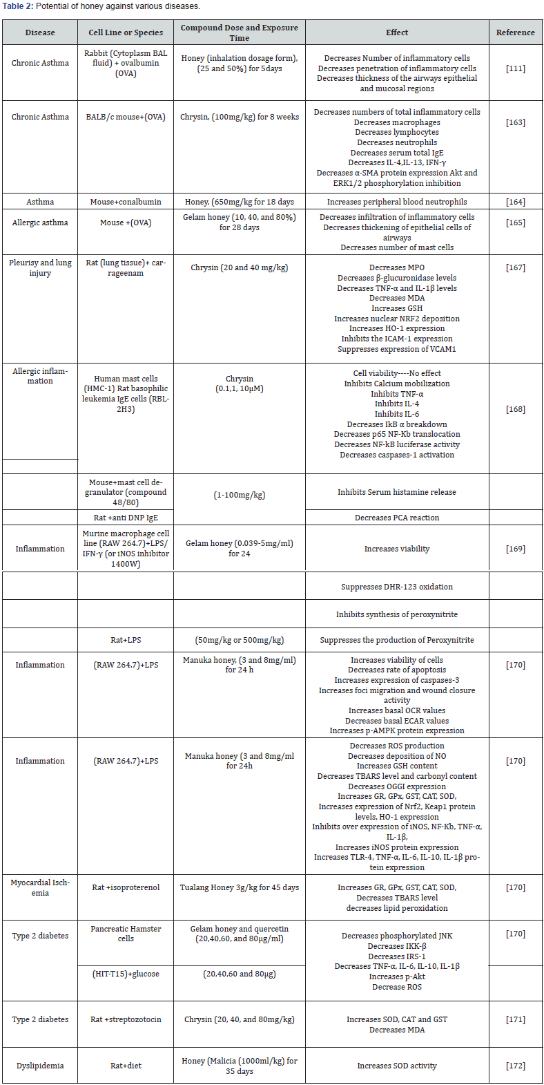 Iinflammation has been provokedbecause of the production of variouspro-inflammatory enzymes and cytokines (low molecular weight compounds or the enzymatic breakdown of tissues). Enzymes are mainly responsible for inflammation process includes cyclooxygenase-2 (COX-2), an isoform of cyclooxygenase (COX), which catalyses the transformation of arachidonic acid to prostaglandin. When inflammation is prolonged or excessive, it may prevent healing or even cause further damage. Drugs used for treatment of inflammation are having several shortfalls such as corticosteroids restrain growth of tissues and limits the immune-reaction, and the non-steroidal anti-inflammatory drugs are detrimental to cells, particularly for stomach [28- 30]. Presently, various severe diseases like SARS-CoV2 can be elucidated due to the overproduction of initial response proinflammatory cytokines [tumour necrosis factor (TNF), IL-6, and IL-1β], called as the cytokine storm. It may increase the threat of vascular hyper-permeability; dysfunction in many organs and ultimately death can occur. Therefore, therapeutic investigations are mainly targeting the over production of cytokines with anticytokine therapies or immunomodulators [31-33]. In this context, honey may be a promising immune modulator as many research studies focus on the anti-inflammatory action of honey free from harmful side effect. Galangin and Chrysin present in honey reduce the inflammation aggravated by various chemicals. Many types of honey including manuka, gelam, Jelly bush and pasture honey has potential to activate or inhibits the secretion of some cytokines (tumor necrosis factor-α, interleukin-1β, interleukin-6) from human monocytes and macrophages, according to the type and severity of inflammation. Studies reported that during inflammatory reaction H2O2 generation stimulated by honey in turn activates the growth of fibroblasts and epithelial cells to revamp the damage caused by inflammation. This effective anti-inflammatory property of honey built it a novel therapeutic alternative to cure the respiratory infectious diseases [34-36] (Table 1).