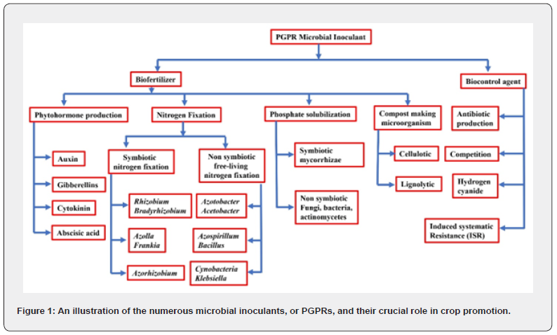 Soil microorganisms are required for both effective nutrient control and soil biodiversity. They are necessary for plant development and growth. In recent years, chemical fertilizers have been employed in agriculture to increase food production and independence for the country, but at the expense of the environment and the health of all living beings. Overusing these fertilizers in farming is costly and has many negative consequences for soil fertility. Beneficial microorganisms offer alternatives to traditional farming approaches for addressing our agricultural needs. Biofertilizers are safer compared to chemical fertilizers, they are more concentrated have fewer negative environmental effects, and function better in smaller quantities. Furthermore, microbial inoculants degrade faster and are less likely to cause resistance to diseases and pests [1]. Because bioinoculants are ecologically friendly but exceptionally powerful and may be used as biopesticides without harming plant products, they have no adverse effects on soil-dwelling animals and plant life. The plant needs mineral nutrients, which can only be obtained through the direct or indirect application of chemical fertilizers in conjunction with organic manure and biofertilizers to boost the content of organic soil and ensure sustainability in fields and horticultural crops [2]. Organisms like bacteria, fungi, and other microbes are microbial inoculants that are introduced into an environment to achieve a specific aim, such as biocontrol or plant development [3]. The word “bio-fertilizer” refers to a wide range of products that contain active or dormant microorganisms such as bacteria, fungi, actinomycetes, and algae. Some bacteria secrete compounds that enhance plant growth, these bacteria help fix atmospheric nitrogen and solubilize or mobilize soil nutrients upon application [4]. In addition to numerous other products, biofertilizers, and biopesticides are now available as alternatives to standard synthetic pesticides, inorganic fertilizers, and inorganic fertilizers, respectively. From 2022 to 2027, the biofertilizer market is predicted to rise at a compound yearly 12.1% growth rate, from 1.57 billion in 2018 [5]. The market is tremendously fragmented because of the vast number of small and large businesses operating in various locations. Because it is now mostly unregulated, the biofertilizer market is dominated by numerous small businesses; however, if rules are enforced, as has occurred in the global market for biopesticides, the market may become more concentrated [6]. Furthermore, because they occur naturally in the rhizosphere, are non-pathogenic, environmentally friendly, and directly increase plant yield, PGPRs are a distinct class of microbes that influence plant defense mechanisms and provide host resistance to further pathogen attack via an incredibly diverse mechanism. As a result, they are regarded as more effective biocontrol agents than traditional chemical fertilizers [7]. PGPRs can directly or indirectly influence plant development and stimulate the development of plant growth by releasing mineral nutrients into soils, controlling or inhibiting phytopathogens, producing various plant growth regulators, improving bioremediation and soil structure by separating toxic heavy metals, and reducing chemical compounds such as fungicides and pesticides [8-10]. In addition to the mentioned roles, PGPRs also contribute to various defense mechanisms in plants by synthesizing volatiles, biosurfactants, antibiotics, siderophores, and enzymes that degrade cell walls and raise systemic resistance (ISR). PGPRs comprise an extensive range of symbiotic and non-symbiotic bacterial species from the genera Azotobacter, Klebsiella, Azospirillum, Bacillus, Serratia, and Enterobacter [11]. Many researchers are continuously working to better understand the diversity, importance, and functions that biofertilizers play in improving agricultural sustainability. Plant age, species, soil conditions, growth phases, and soil types all influence the impacts of PGPRs [12]. Enhancing plant nutrient absorption is an important function of PGPR that is suitable for crop development [13,14]. PGPRs resist the loss of plant development caused by a variety of stresses [15], consisting of heavy metals stress [16], waterlogging stress [17], salt stress [18,19], drought stress [20], and other unfavorable environmental conditions. PGPR inoculation reduces plant stress, which improves growth, fitness, nutrient uptake, and production. PGPRs are thus necessary for continuous, advantageous agricultural reasons, such as increasing soil fertility and crop yields in tough conditions. In recent decades, PGPRs have been increasingly used for safe and secure agriculture around the world. The lack of superior bioinoculants is the biggest obstacle to farmer’s success. Azolla, Azotobacter, Acetobacter, Bacillus thuriengensis, Trichoderma, and Azospirillum must be carefully considered before being employed in grain and vegetable crops. These biofertilizers are used in conjunction with chemical fertilizers and organic manures to increase soil organic carbon content and ensure crop viability [2] (Figure 1).