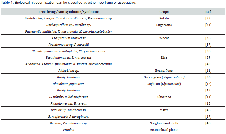 The mutualistic association between bacteria and plants is known as symbiotic nitrogen fixation (SNF). Symbiotic nitrogenfixing bacteria may access all types of plants and fix atmospheric nitrogen in a symbiotic manner. When a plant starts producing iso-flavonoids and flavonoids in its rhizosphere, Rhizobium sees this as the start of a mutualistic relationship [23]. Rhizobium, Bradyrhizobium, Sinorhizobium, and Mesorhizobium are examples of bacteria that coexist with leguminous plants symbiotically, while Frankia coexists symbiotically with shrubs and non-leguminous plants [24]. Rhizobium is the most common symbiotic nitrogenfixing bacteria in legume crops. In addition to bacteria, certain small ferns act as symbiotic nitrogen fixers. As an example, the tiny, free-floating aquatic fern Azolla interacts with cyanobacteria (Anabaena) to fix nitrogen from the atmosphere. In exchange for fixed nitrogen, Azolla provides Anabaena with optimal circumstances, nutrition, and phytohormones. The nitrogenfixing phenomenon occurs in Anabaena’s heterocyst cells. Azolla mostly aids rice growing by incorporating biomass and nitrogen fertilizer into the soil. Actinorhizal plants can acquire root nodules from actinomycetes such as Frankia. Some genera, such as Myrica, Allocasuarina, Eleagnus, Coriaria, and Casuarina, can nodulate Frankia. These plants are monocots with an assurance future in agriculture and reclaimed land. Bacillus and Azotobacter species fix nitrogen, which stimulates the growth and development of forest crops and maize plants [25]. Bradyrhizobium japonicum inoculation enhanced soybean plant growth, and nitrogen fixation [26].