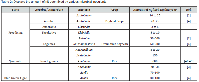 Plants’ root zones include free-living nitrogen fixers, which feed on and absorb nutrients. Diazotrophs also help in nonsymbiotic nitrogen fixation by stimulating the growth of nonleguminous plants like radish and rice. Enterobacter, Azotobacter, Burkholderia, Diazotrophicus, Pseudomonas, Gluconacetobacter, and Cyanobacteria (Nostoc, Anabaena) are examples of rhizopheric bacteria that do not fix nitrogen symbiotically [27,28]. Azotobacter chroococcum can fix 10mgN/g of carbon source in vitro, indicating that it can be employed as a biofertilizer [29]. A. brasilense decreases N fertilization, improves plant nutrition, increases plant biomass, and boosts wheat grain output [30]. Acetobacter, Herbaspirillum, Diazotrophicus, and Azospirillum, are nitrogen-fixing bacteria that thrive with C4 plants such as bajra, maize, sorghum, sugarcane, and cereals including rice, barley, and wheat [31]. Azospirillum inoculation yielded notable outcomes in sorghum, wheat, maize, and other grass seedlings. The total nitrogen requirement of rice and corn is about 25% which is contributed by bacteria [32].