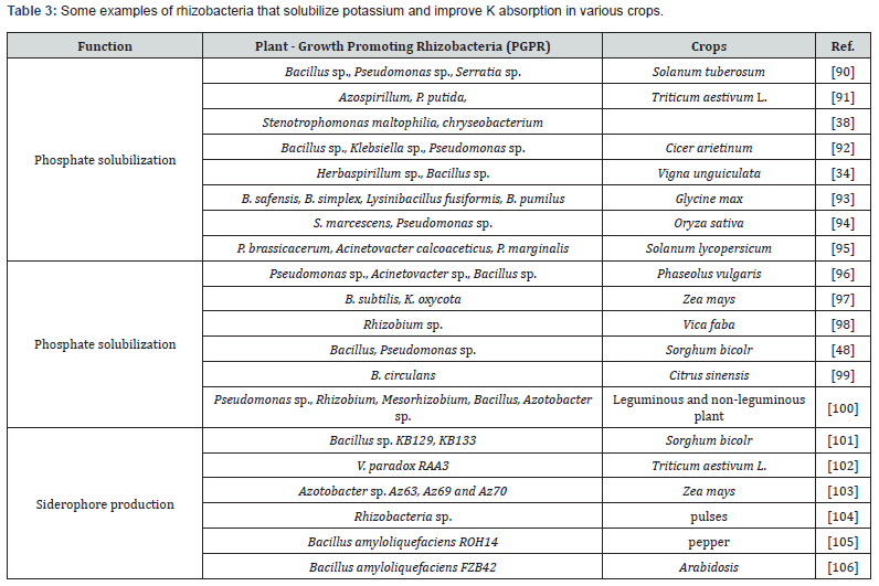 Potassium (K) is the 3rd most significant macronutrient for plants. Insoluble rock made mostly of silicate minerals has greater than 90% potassium. It plays a role in protein synthesis, food intake, regulating opening and closing of stomata, enhancing product quality, and providing adaptability to harsh environmental conditions [61]. It is required for enzyme activation, protein biosynthesis, and photosynthesis. Lack of potassium concentration causes several major problems for plants throughout development, including slow growth, bare roots, and reduced yield and seed production [62]. To maintain crop output, potassium prominence, and plant absorption in the soil should be preserved [63]. The solubilization of potassium rock by PGPRs via the formation and release of organic acids has been extensively researched [64-66]. PGPRs, such as Paenibacillus sp., B. edaphicus, and Ferrooxidans sp., can easily detect potassium levels in soil by solubilizing and releasing potassium components from potassiumcontaining minerals [67]. Using potassium-solubilizing PGPRs to increase agricultural nutrients can reduce the application of synthetic fertilizers while promoting sustainable agricultural output [68,69]. Biofertilizers as items containing dormant spores and live microbes or the inoculum they carry that benefit plants, particularly the soil, seed, and root [70]. Potassium solubilizing bacteria to plant seeds typically resulted in a significant improvement in seedling vigor, productivity, potassium uptake, and plant growth [64,71]. The formation of organic acids directly enhances K dissolution via indirect or ligand-mediated mechanism by creating a compound in solution with reaction products. This is the way KSB distributes potassium to plants. Using Potassium solubilizing bacteria as a biofertilizer can contribute to enhancing environmentally sustainable agricultural output by reducing the need for chemical fertilizers while enhancing plant growth and yield [72]. These technologies are increasingly indispensable in today’s agricultural operations. Biofertilizers will make a stronger argument in the upcoming years as farming techniques change and environmental dangers added with chemical fertilizers become more apparent.
