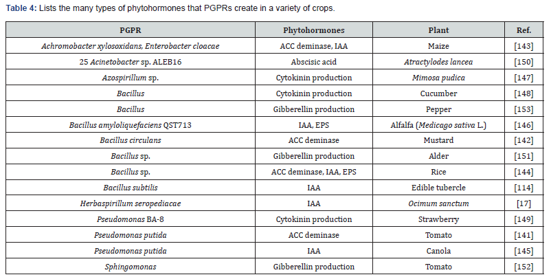 Tetracyclic diterpenoid compounds that is Gibberellins, have a role in a variety of plant physiological and developmental processes [116]. More than 136 gibberellins are widely distributed in nature [117], with GA3 being the most regularly used and GA1 being the most active. Geranyl diphosphate can be turned into gibberellins by a variety of methods. GAs activates maximum biological activity, such as fruit growth and floral induction in plants, stem elongation, production of amylolytic enzymes, and seed germination by breaking seed dormancy [118]. Gibberellin synthesis is required for stem growth; low or non-existent gibberellin levels lead plants to grow to a minimum height. Gibberellins are produced by the fungus Gibberella fujikuroi as well as the plants themselves. Nonetheless, several studies have shown that PGPRs, such as Xanthomonas, Pseudomonas, Agrobacterium, Micrococcus, Rhizobium Bacillus, Azospirillum, and Clostridium, produce gibberellins [119-122].