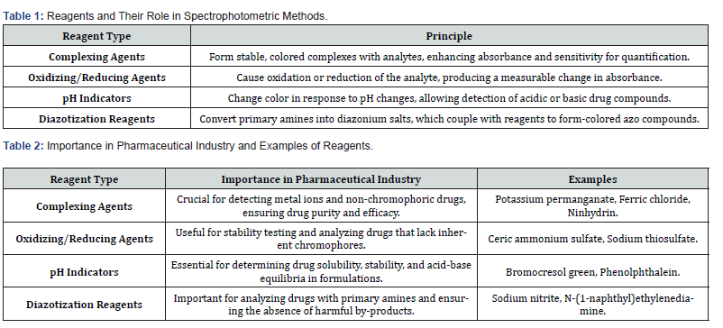 Spectrophotometry is a fundamental analytical technique widely used in pharmaceutical science for both qualitative and quantitative analysis of drug compounds. Its principle is based on the measurement of light absorbed by a substance at specific wavelengths, which is directly proportional to the concentration of the analyte. Spectrophotometric methods are valued for their simplicity, cost-effectiveness, and ability to analyze drugs with minimal sample preparation. Various reagents, including complexing agents, oxidizing/reducing agents, pH indicators, and diazotization reagents, are employed to enhance detection and accuracy. These reagents play a crucial role in forming colored complexes or inducing chemical changes that increase the absorbance of drug compounds, allowing for precise measurements. Spectrophotometry is commonly applied in pharmaceutical assays, dissolution studies, stability testing, impurity profiling, and bioanalysis. Its high sensitivity enables the detection of trace impurities and degradation products, making it essential for quality control and regulatory compliance. Despite some limitations, such as interference from excipients and matrix effects, spectrophotometric methods remain indispensable in pharmaceutical research and industry. Continued advancements in reagent development and method optimization are expected to enhance the selectivity and reliability of these techniques.
