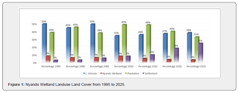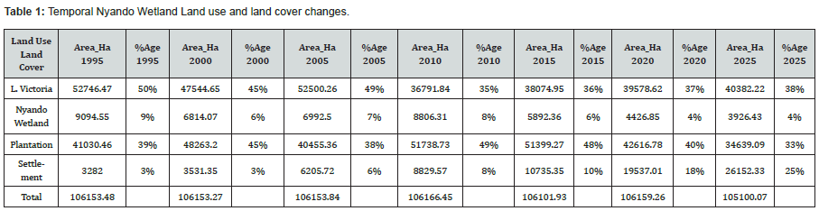 This section presents the findings of the study as guided by the objectives. The study assessed how rice farming in Nyando wetland influences land-use and land cover changes in the area. This was done by using AI-powered remote sensing techniques. This involved analysis of temporal changes from the year 1995 to 2025. The study quantified the areas covered by L. Victoria, the Nyando Wetland, rice plantation (rice paddies) and settlements in these selected years. Equally, the study evaluated the impacts of rice farming on water quality using AI-based predictive analytics. The study also analyzed the effects of rice production on biodiversity and ecosystem health using AI-driven ecological modeling. These were examined in the following categories: