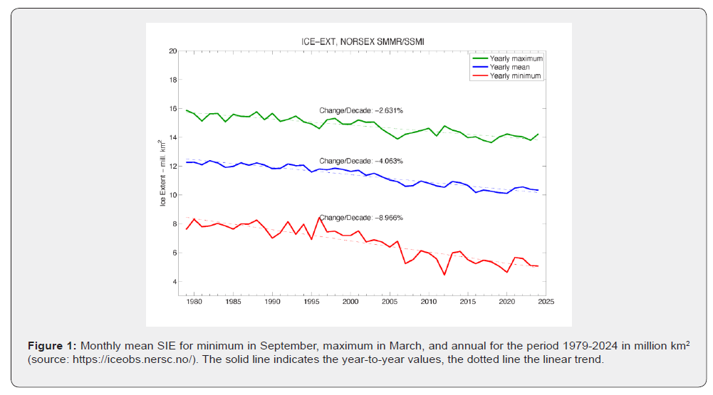 Summer Sea-Ice Extent (SIE) is one of the most important climate indicators, in particular the September minimum. In the period 1979–2024, the September monthly minimum has decreased by about 40% based on US satellite passive microwave data (Figure 1, https://iceobs.nersc.no/) which also show that the winter maximum in March has decreased with about 12% and annually with about 18%. The summer ice in September decrease is primarily forced by the increase in the CO2 concentration in the atmosphere from a mean of 333ppm in September 1979 to a mean of 422ppm in September 2024, observed at Mauna Loa, Hawaii https://gml.noaa.gov/. The variations around the linear decreasing trend line of the SIE are caused by natural variability (Figure 1), as reviewed by Johannessen & Shalina [1] and a recent review of the projections of an ice-free Arctic Ocean by Jahn et al. [2].