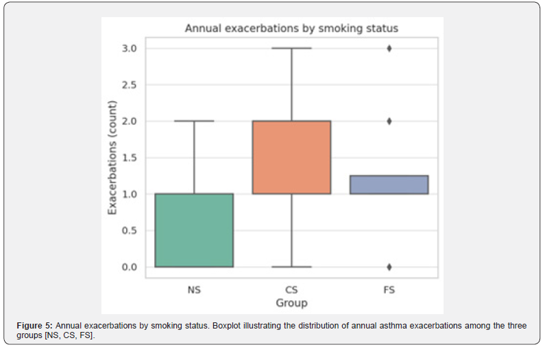 Current smokers have the highest concentration of patients experiencing two or more exacerbations, while never smokers are skewed toward fewer events. (Figure 5) shows the Boxplot illustrating the distribution of annual asthma exacerbations in never smokers (NS), current smokers (CS), and former smokers (FS). Current smokers show the highest median and widest variability, while never smokers report the lowest frequency of exacerbations. (Figure 6) mean outcomes at one year, represented by heatmap of mean values for lung function (FVC, FEV1, FEV1/FVC), ACQ scores, and exacerbations across groups at one year. Never smokers consistently demonstrate the most favorable outcomes, while current smokers show the poorest results, with former smokers in between.