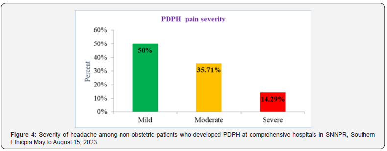 Among seventy patients who developed PDPH, most of them developed mild PDP pain 35 (50.00%) (Figure 4).