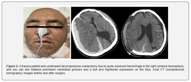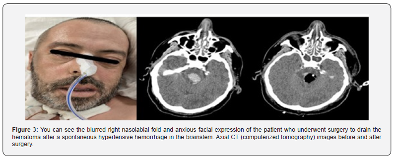 To date, numerous studies have been conducted to reveal the afferent and efferent connections of facial expressions and facial expressions with the cerebral cortex, intrinsic structures and cranial nerves. In particular, it has been shown that the cerebral cortex, amygdala-limbic system, basal ganglia and trigeminalfacial cranial pairs are in synchronous harmony with the facial muscles, especially in the formation of facial expressions. In his article in 2024, Bress explained all these anatomical structures in detail and provided readers with a nice experience about their relationship with facial expression [10]. Again, Erzurumlu et al. provided valuable information to readers in his article titled “Mapping the face in the somatosensory brainstem” in 2010 [9]. In our article, we would like to share with you the facial expressions of patients with various cerebral pathologies that we follow in the neurosurgery intensive care unit, by comparing them with the findings on brain computed tomography. These are presented to you, the readers, as evidentiary products of the facial-emotional communication pathways mentioned above (Figure 3).
