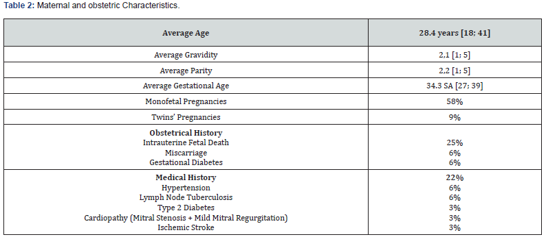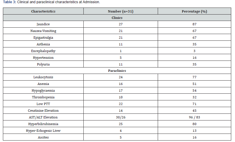 The frequency of AFLP was 1% in our study. The average age was 28 years [18; 41] with a predominance of the age group from 26 to 34 years in 42%. Patients were referred in 61% and came from provincial hospitals 32%, clinics 9% and regional hospitals in 6%. The patients were multigravida and multiparous in 64%. The maternal and obstetric characteristics are described in (Table 1). Among the reasons for admission, there was mucous jaundice in 77%, epigastralgia in 19%, nausea-vomiting in 16%, pre-eclampsia in 12%, right hypochondrium pain in 6%, asthenia in 3%, polyuria in 3% and hemorrhagic syndrome in 3%. Patients were admitted during antepartum in 54% and post-partum in 45%. (Table 2) shows the distribution of patients according to the main clinical and paraclinical characteristics. The therapeutic management consisted of an interruption of pregnancy in 54% by caesarean section 45%. This termination of pregnancy was performed under spinal anesthesia in 85% (Table 3). The administration of diuretics 29% and extra renal cleansing in 16%. The correction of coagulopathy with the transfusion of fresh frozen plasma (FFP) 45%, red blood cells 45%, administration of fibrinogen 3% and vitamin K 29%. Plasma exchanges were performed in 16%. In patients who benefited from plasma exchanges, the average of the sessions was 2. Plasma exchanges were performed with FFP and albumin infusions. No complications related to plasma exchange were reported.