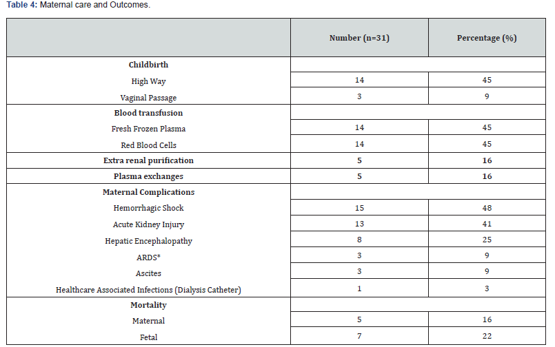 Results: Thirty-one patients were included with a frequency was 1%. The average age was 28 years [18; 41]. The patients were multigravida and multiparous in 64%. The pregnancies were mono-fetal in majority 58%. The average pregnancy term was 34 WA [27; 39]. The clinical characteristics were icterus 87%, nausea-vomiting 67%, Epigastralgia 67%, asthenia 35%, polyuria in 35% and encephalopathy 3%. High blood pressure was found in 16%. The biological abnormalities were hypoglycemia in 54%, anemia in 51%, thrombocytopenia in 32%, leukocytosis in 77%, low PTT in 71%, uremia in 22%, high creatinine level in 45%, hepatic cytolysis in 96% (AST) and 83% (ALT), hyper-bilirubinemia in 80%. Ascites was present in 16% and a hyper-echogenic liver in 13%. A termination of pregnancy was performed in 54% by cesarean section 45%, under spinal Anaesthesia in 85%. Extra renal cleansing was performed in 16%. Plasma exchanges were performed in 16%. The average duration of stay was 6 days [2; 13]. The main maternal complications were hemorrhagic shock in 48%, acute kidney injury in 42%, hepatic encephalopathy in 25%, acute respiratory distress syndrome (ARDS) in 9%, ascites in 9%. The evolution was burdened with a maternal mortality of 16% secondary to refractory hemorrhagic shock with multi-organ dysfunction syndrome. Fetal mortality was 22%. Risk factors associated with maternal mortality were gestational age, asthenia, hepatic encephalopathy and hemorrhagic shock.