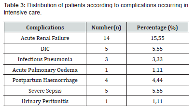 During this period, 90 patients were admitted to intensive care for obstetric complications, representing 35% of hospitalisations. The average age was 24 (range 15-40). In our series, there was a clear predominance of multiparous women (65%). The main medical histories found were asthma (1 case), high blood pressure (HBP) (2 patients), cardiomyopathy (3 cases) and diabetes (3 cases). The main maternal complications leading to admission to intensive care are shown in (Table 1). The most common was obstetric haemorrhage (48 cases), including 33 cases of HRP, 12 cases of HPP and 3 cases of uterine rupture. The second most common cause of admission was pre-eclampsia syndrome, with 34 cases (37.77%). Other reasons included cardiac problems (3 cases), renal problems (2 cases) and diabetic ketoacidosis (3 cases). (Table 1) shows the distribution of patients according to the reasons for hospitalisation. The majority of patients were admitted in the postpartum period (91%) and 14 patients (15.55% of cases) had given birth vaginally. General anesthesia was the most commonly used anaesthetic technique (89% of cases). In terms of intensive care treatment, 15 patients (16.16%) received respiratory support with orotracheal intubation and antihypertensive treatment based on nicardipine was initiated in 27 patients (30% of cases). Blood transfusions and tranexamic acid were used in 66.66% and 61.11% of cases, respectively. Fifteen patients (16.16%) received vasopressor amines and three underwent haemodialysis. (Table 2) shows the distribution of patients according to the treatment administered in intensive care. Twenty-four patients (26.66%) experienced complications during their stay in intensive care. The most common complications were acute renal failure (14 cases), infectious pneumonia (4 cases), disseminated intravascular coagulation (5 cases) and severe sepsis (5 cases). (Table 3) shows the distribution of patients according to complications. The average length of stay in intensive care (ALOS) was 3.63 ± 1.82 days (range 1-13 days). The outcome was favorable in 83 cases; 07 patients died, representing a mortality rate of 7.77%. The causes of maternal death recorded were DIC (04 cases), severe sepsis (02 cases) and APE (acute pulmonary oedema) on ARF (acute renal failure) (01 case). There was a significant relationship between mortality and mechanical ventilation in intensive care, with a p value = 0.000. Mortality was closely linked to the occurrence of ARF (p = 0.047) and DIC (p = 0.000). The analytical study of mortality in our series identified several factors associated with poor prognosis. These were mainly the presence of DIC, ARF and the use of mechanical ventilation in patients.