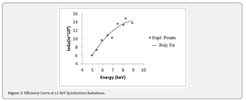 Here σpk (E) is the K shell photoionisation cross-sections reported by Scofield [21] for the given element at the excitation energy E. ωK and Fk are the K- shell fluorescence yield reported by Krause [22] and fractional X-ray emission rates for Kβ,α X-rays reported by Scofield [18]. By using these data, an efficiency curve has been obtained between IoGεLi and characteristic X-ray energies as shown in Figure 2.