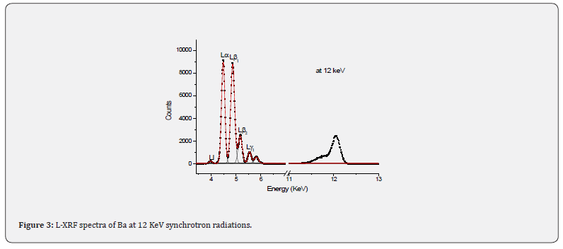 By using a constant function for the background radiation and Gaussian function, various L X-ray peaks were fitted and analysed by using software Origin Pro 8.5. Typical L XRF spectra for Ba at 12KeV with synchrotron radiations is shown in Figure 3.