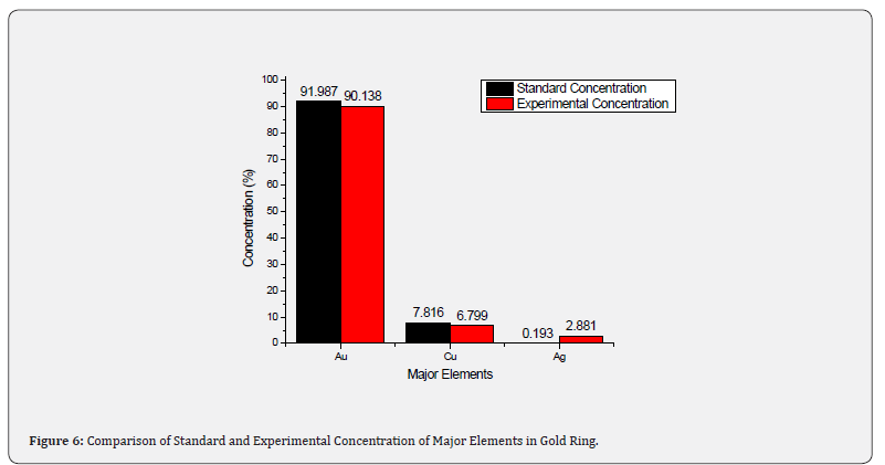 The gold sample i.e. gold ring has been analysed with EDXRF technique and results are shown in Table 1. Three main constituents Au, Cu and Ag were found in major concentration with amount of 90.138, 6.799 and 2.881% respectively. Besides this, traces of Ni are also observed during analysis. For the authenticity of the present results, BIS 22 carat gold sample was also analysed and Au, Cu and Ag were observed as 91.987, 7.816 and 0.193% respectively. Figure 6 illustrates the comparative presentation of major elements in gold ring sample.