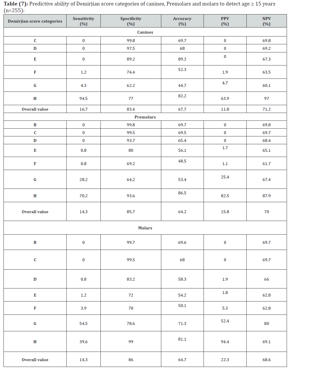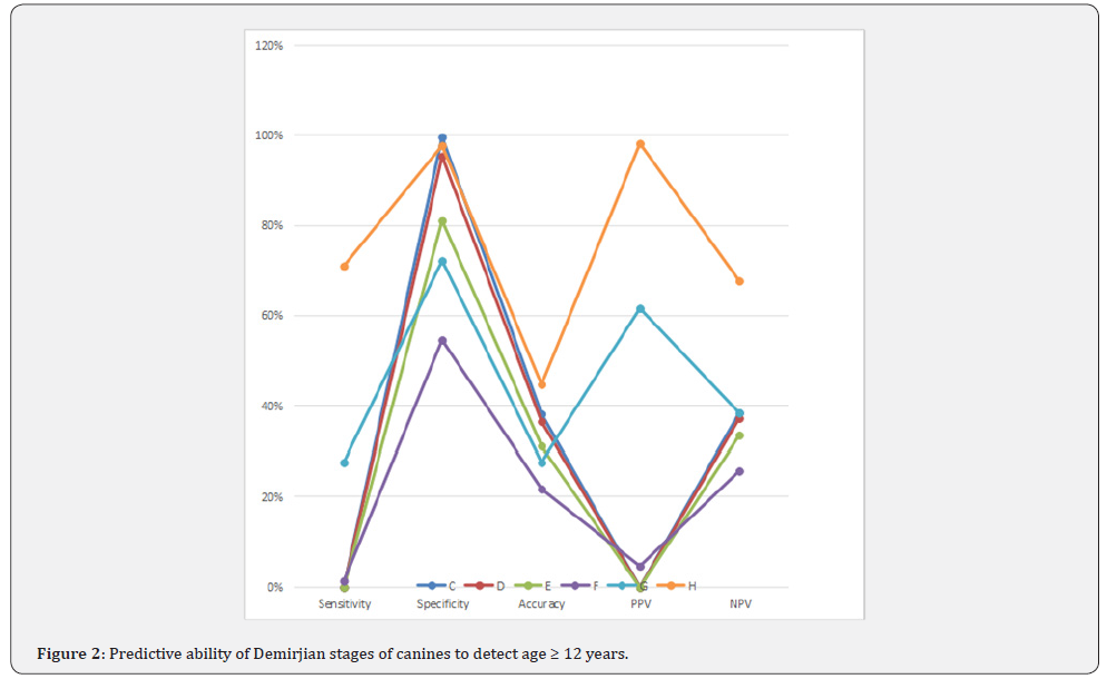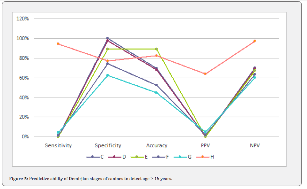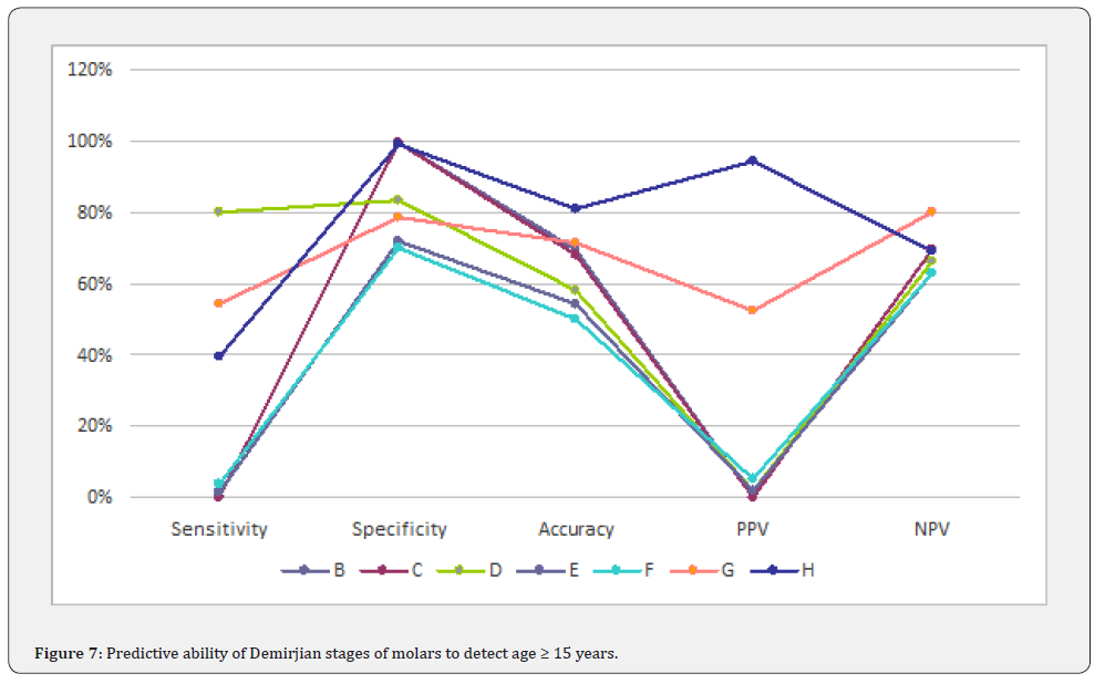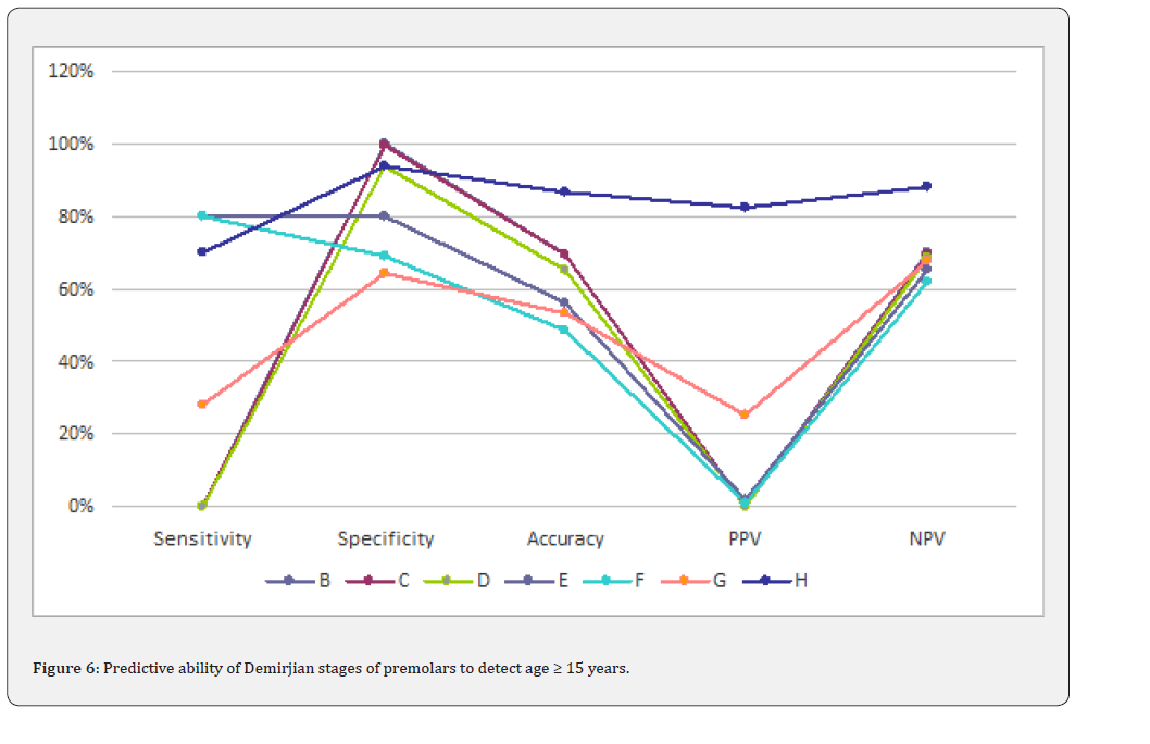 Pinchi et al. [24], stated that a very high probability (at least 90%) and the specificity issues (to avoid false positives) are essential to support the age assessment process and to fulfil the legal requirements in criminal court. When applied to the present results, the cut-off stage to detect the threshold of 12 years can be stage G for second molars (98.8% specificity and 98.5% post-test probability), stage G for second premolars (90.7% specificity and 89.4%. post-test probability) while stage H for canines (97.8% specificity and 98.1% post-test probability) can be obtained. The current study showed that completely erupted teeth until the occlusal level (stage H) were good indicators to predict age over or equal to 15 years, in canines [94.5% sensitivity, 77% specificity] and second premolars [70.2% sensitivity, 93.6% specificity] but stage G for second molars [54.5% sensitivity, 78.6% specificity].