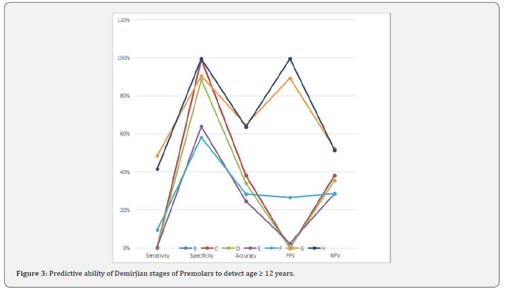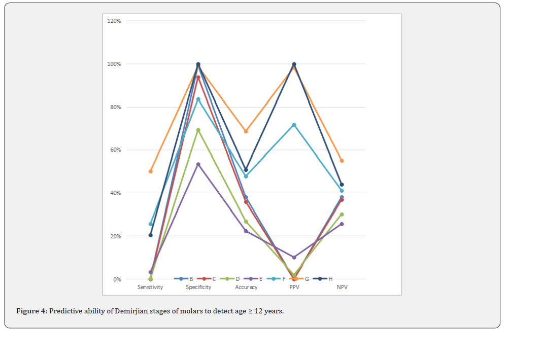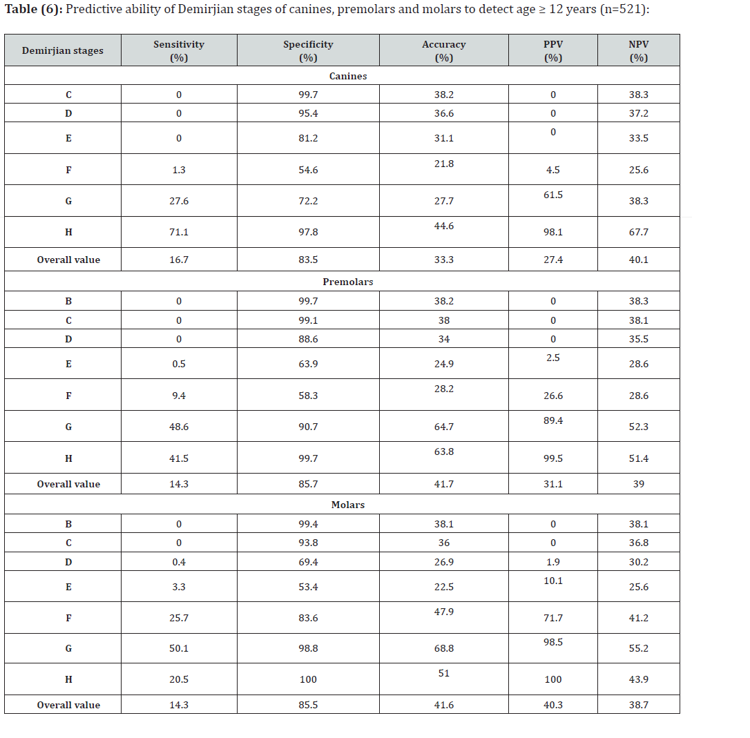 Additionally, the present results correspond with Marques et al [18] findings that the eruption and the formation of the teeth tend to be more advanced in females. The present study shows that canines of most children (about 45%) were in stage H, while most of them showed stage G for the second premolars and the second molars (about 34% and 31% respectively). This is expected as the development of canines is completed at an earlier age than the second premolars and the second molars. This corresponds with the findings of Uysal et al. [21] who suggested that the first premolar root formation and completion of the mandibular canine can be used as an indicator of maturity for a pubertal growth spurt. Similarly, Krailassiri et al. [22] and Trakinienè et al. [23] have demonstrated that the second premolar, maxillary canines and mandibular second molars are highly correlated with skeletal maturity and growth. The present data showed that most of the studied children ≥12 y showed stage H for canines (71.1% sensitivity, 97.8% specificity), and stage G for second premolars (48.6% sensitivity, 90.7% specificity) and stage G for second molars (50.1% sensitivity, 98.8% specificity). On the other hand, most of the studied children aged less than 12 y showed stage E for second molars and stage F for canines and second premolars.