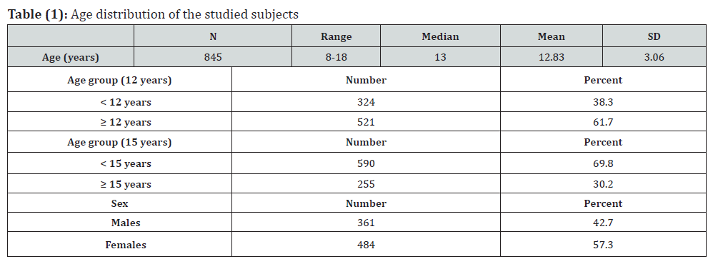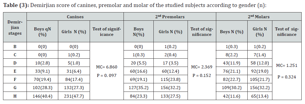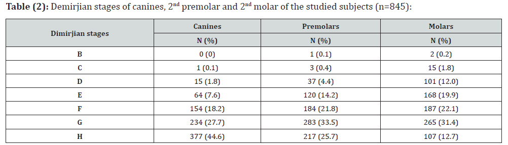 The present study included ortho-pan tomographs of 845 participants of known age and sex (484 girls and 361 boys). Their chronological age (real age) ranged between 8 and 18 years with a mean 12.82 ± 3.06 years (median: 13 years). It was found that (38.3 %) of children were less than 12 years old while (69.8%) of children were less than 15 years old (Table 1). Results of this Egyptian sample according to Demirjian stages of canines showed that most of studied children were in stage H, while the least were in stage C. Meanwhile, Demirjian staging of the second premolars and the second molars, showed that most of the studied children were in stage G, while the least were in stage B as shown in table (2). There was no significant difference between boys and girls regarding Demirjian stages of canines, 2nd premolars and 2nd molars (Table 3). For children at or more than 12 years, most of the samples studied showed that canines were in stage H meanwhile, second premolars and second molars were in stage G. On the other hand, in children less than 12 years, most of the samples studied showed that canines and second premolars were in stage F; meanwhile, second molars were in stage E. There are significant differences observed between groups of canines, second premolars and second molars (p < 0.001) at the cut-off point of age 12 years (Table 4). Girls tend to be advanced in the formation and the eruption of the teeth before boys.