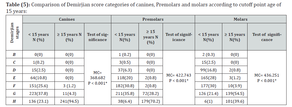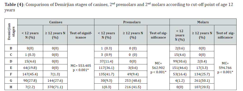 It is quite different in medico-legal consequences if an individual with an unknown age is below or above 12 and 15 years. Therefore, age must be estimated individually using different criteria in children between 8 and 18 y. Forensic age assessment in unidentified individuals should include left-hand plan radiography and physical dental examination followed by an ortho-pantomogram according to the guidelines of International Interdisciplinary Study Group on Forensic Age Diagnostics (AGFAD) [10]. Many studies and reviews had written a lot about the use of teeth and their time of eruption in age estimation in forensic sciences [11,12,13]. Previous studies reported he estimation of dental age in Egyptians individuals [14,15,16,17]. Age estimation using teeth is more precise, reliable and acceptable under the age of 15 years because at the same time there are multiple teeth at different developmental stages [18,19]. This is the first Egyptian study “to the best of our knowledge” that uses Demirjian developmental stages of three mandibular permanent teeth (canine, second premolar and second molar) for determining age of 12 and 15 years. This study confirms previous results by Tomás et al [20] and Marques et al [18], that there were no significant differences between boys and girls regarding the frequency of Demirjian developmental stages of canines, premolars and molars.