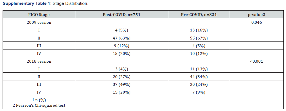 Based on FIGO 2009, more patients presented with earlier stage (I/II) cervical cancer pre-COVID as opposed to post- COVID (87% and 67%, respectively), as shown in (Table 2). After applying the FIGO 2018 system, stage I/II distribution at diagnosis dropped to 67% and 31%, respectively. The presence of nodal involvement, as depicted by the FIGO 2019 IIIC category, was doubled in the post-COVID cohort (42%) compared with the pre-COVID cohort (21%). In addition, the proportion of patients with stage IVA disease was almost three times as high post-COVID (17% versus 6%). A small number of patients with IVB cervical cancer were included as they had small volume bony metastases or peritoneal involvement limited to the pelvis. Overall, there was a statistically significant pattern of stage migration post-COVID (see Supplementary Table 1).