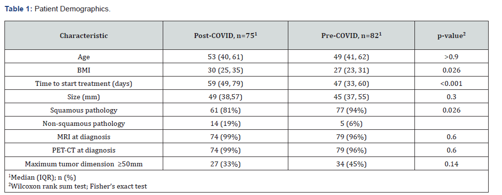 Slightly fewer patients were referred for CCRT in the post- COVID period (n=75) compared with pre-COVID (n=82). Patient demographics are illustrated in (Table 1). Median age was similar across the two groups but body mass index (BMI) was higher (p=0.026) and there was a greater preponderance of non-squamous histology in the post-COVID cohort (p=0.026). The median tumor size was larger post-COVID at 49mm compared with 45mm pre- COVID, but this did not reach statistical significance (p = 0.3). There were more tumors measuring ≥50mm post-COVID and the largest maximum tumor diameter of 130mm was also recorded in this time period. Rates of diagnostic imaging were analogous, indicating that access to accurate staging was not compromised, but median time to start treatment was significantly higher post- COVID (p<0.001).
