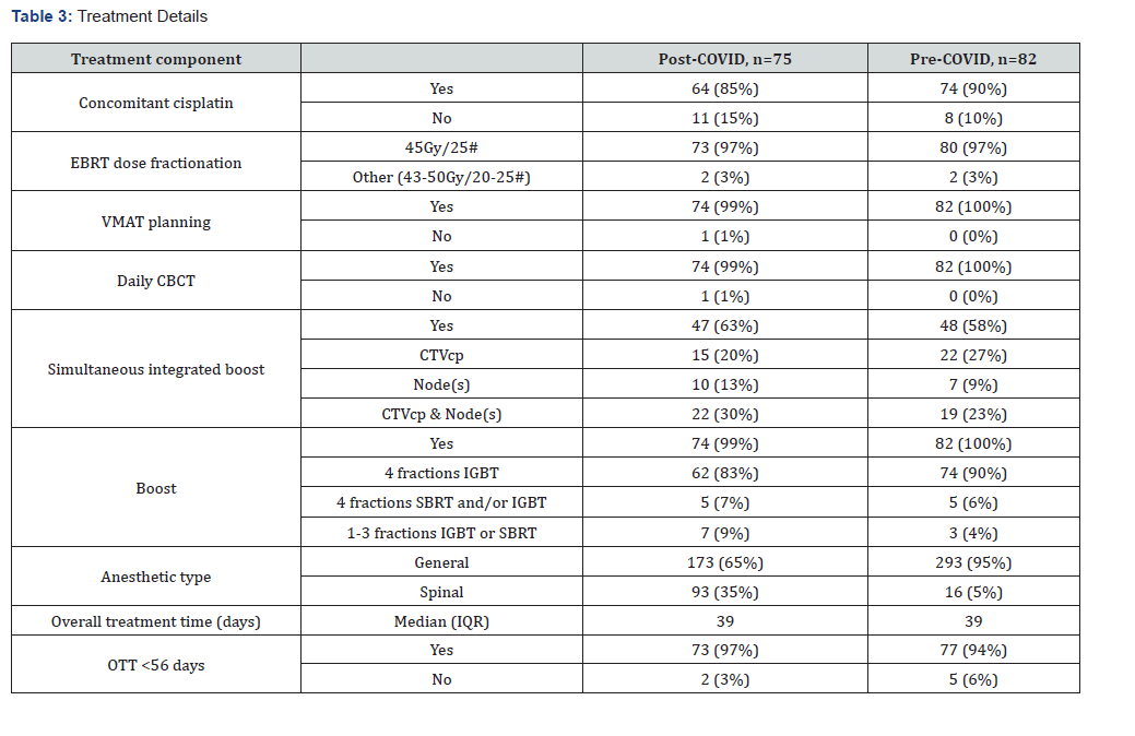 The prescribed dose fractionation regimen for EBRT was predominantly 45Gy/25# (97% in both cohorts). The proportion of patients completing all EBRT was 90% (74/82) pre-COVID and 99% (74/75) post-COVID. In virtually all cases, EBRT was delivered by VMAT with daily CBCT. SIB was incorporated in approximately 60% of EBRT plans in both cohorts, with a slightly higher frequency of lymph node boosts delivered in the post- COVID period (43% compared with 32% pre-COVID).