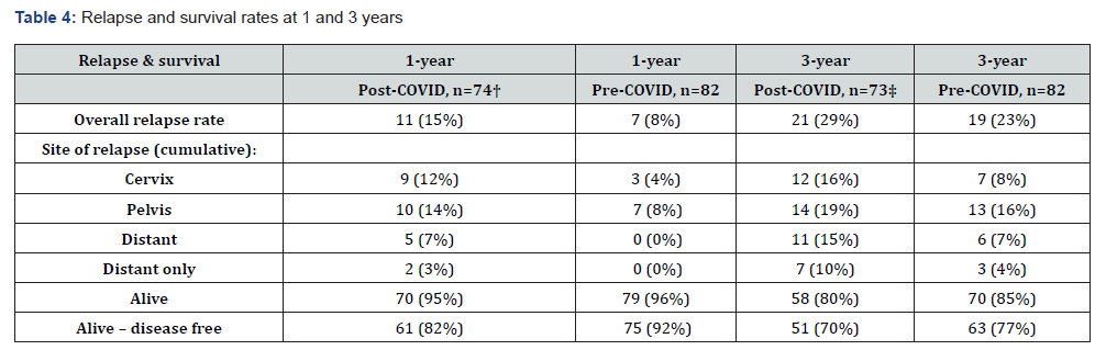 Relapse data and the proportion of patients alive at one- and three-years post diagnosis are depicted in (Table 4); two patients were excluded from the analysis as they were lost to follow up. Persistent disease and/or cumulative relapse rates at one year and three years were 8% and 23% in the pre-COVID cohort and 15% and 29% in the post-COVID cohort, respectively. Local, pelvic, and systemic control rates were all marginally higher in the pre- COVID treatment period. Accordingly, more patients were alive and disease free in the pre-COVID cohort (77%) including four patients who were surgically salvaged (either exenteration for central relapse or resection of a solitary metastasis).