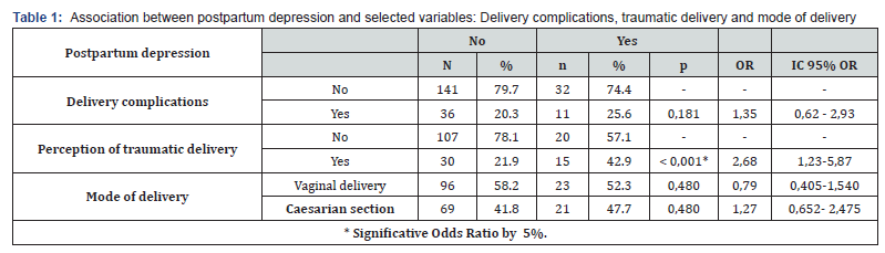 The (Table 1) demonstrates the association between postpartum depression and history of complications during delivery, a psychologically traumatic delivery, delivery mode preference and mode of delivery.