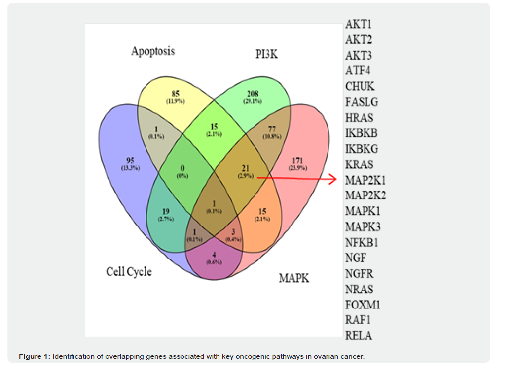 A total of 4,204 differentially expressed genes (DEGs) were identified in OC samples, among which 100 genes showed significant association with overall survival (OS) in OC patients. The intersection between DEGs and OS-related genes revealed 16 key genes with both differential expression and prognostic significance. Comparative analysis with GSE7463 and GSE14407 datasets identified 432 overlapping DEGs, including 159 upregulated and 274 downregulated genes. The Venn diagram illustrates the distribution of DEGs across four critical signalling pathways apoptosis, PI3K, MAPK, and cell cycle highlighting the genes uniquely enriched in each pathway as well as shared subsets across multiple pathways. These overlapping genes represent potential drivers of OC pathophysiology and candidate prognostic markers.