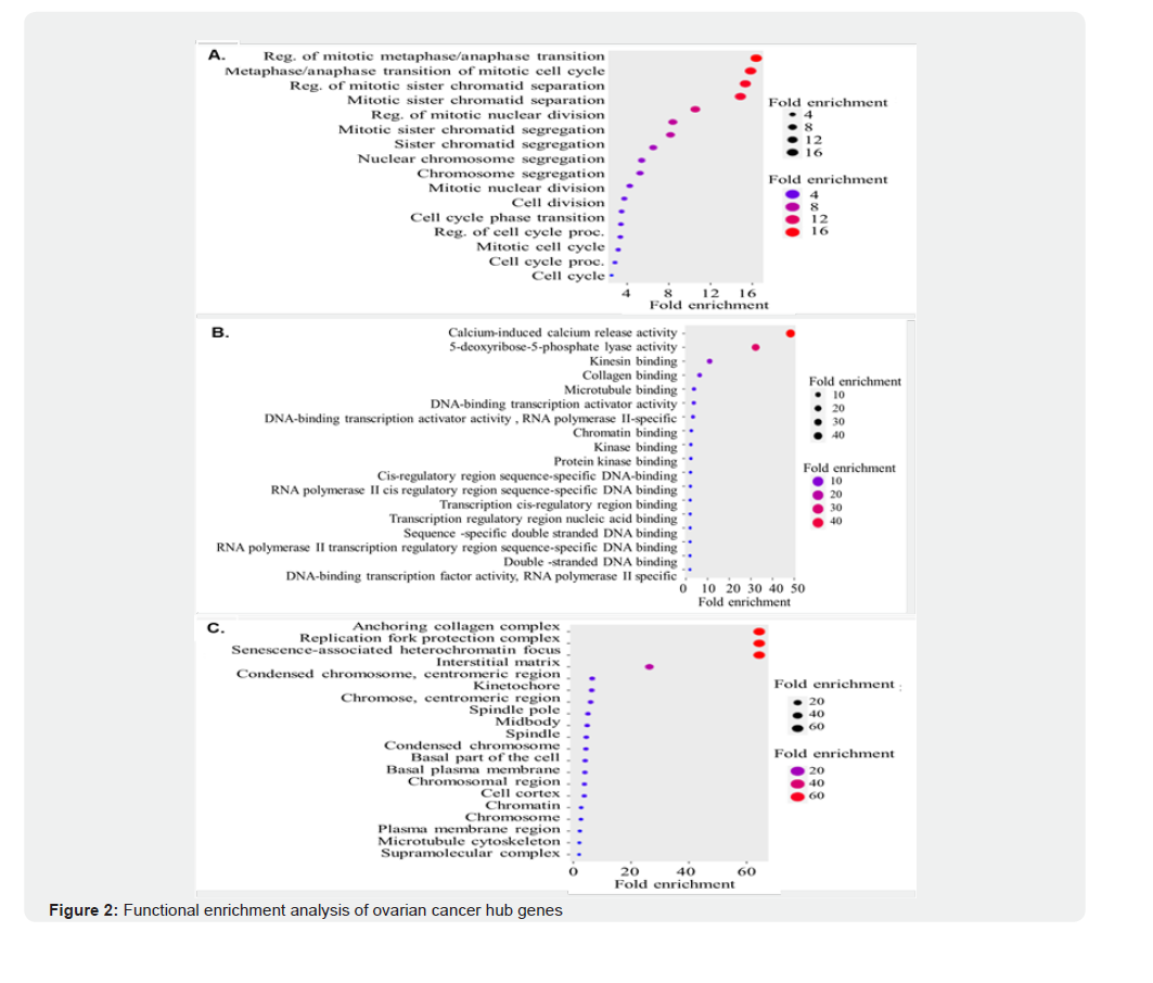 GO analysis of the shared DEGs was conducted using the ggplot2 R package, focusing on the top 10 significantly enriched GO terms and pathways based on p-values. GO BP analysis revealed that these DEGs were significantly enriched in processes associated with cell cycle regulation, particularly mitotic transitions and chromatid segregation. Notably, the highest fold enrichment was observed in pathways regulating the mitotic metaphase-anaphase transition (Figure 2A), indicating that dysregulation of these processes may be pivotal in OC pathology, as well as in the biological conditions reflected by the GSE7463 and GSE14407 datasets.