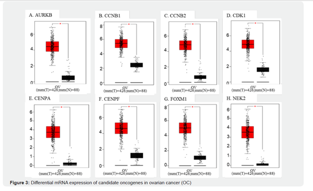 Hub genes were identified based on degree centrality in the PPI network. The top eight genes with the highest node degrees were selected as hub genes [21]. Validation was performed using The Cancer Genome Atlas (TCGA) data via GEPIA, comparing OC and normal tissues with |log2FC| > 1.5 and p < 0.05.