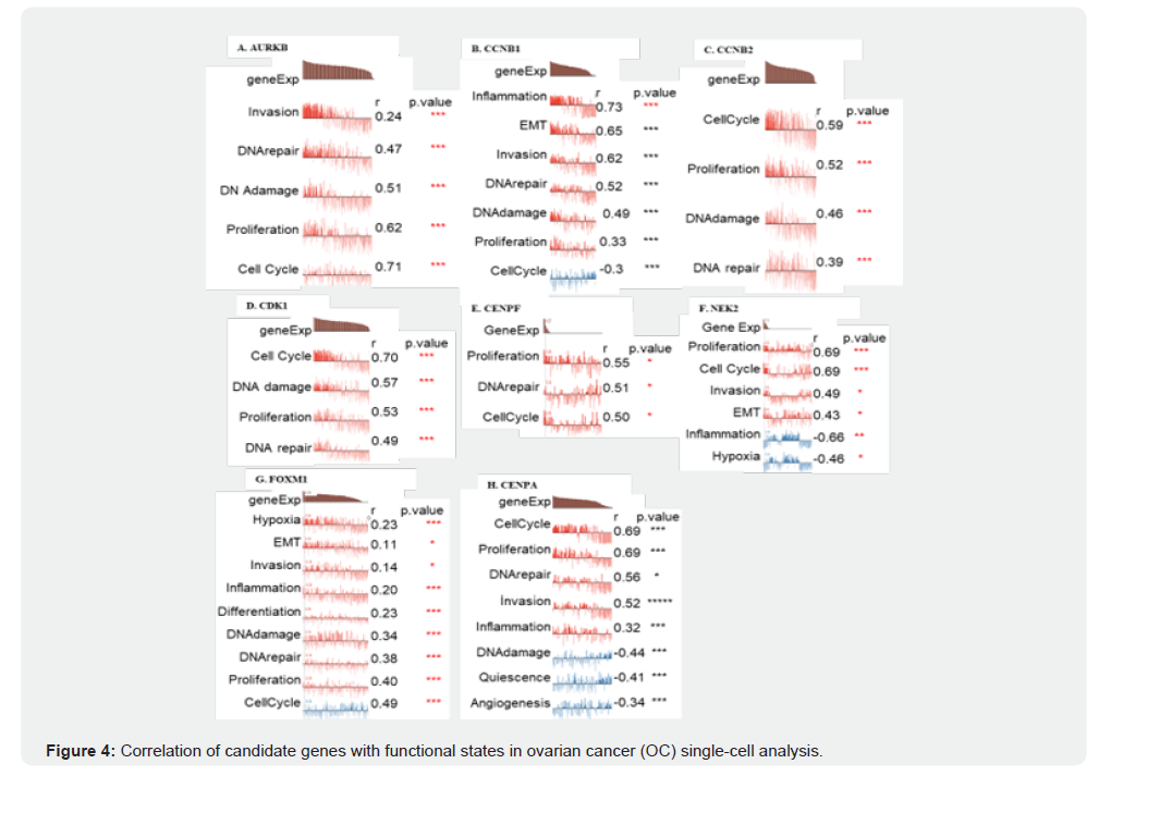 Single-cell transcriptomic functional state analysis was performed to evaluate the association of eight genes (AURKB, CCNB1, CCNB2, CDK1, CENPF, NEK2, FOXM1, and CENPA) with key cancer-related processes. (A–H) Correlation plots depict the relationship between gene expression levels and functional states, including cell cycle, proliferation, DNA damage, DNA repair, invasion, epithelial–mesenchymal transition (EMT), inflammation, angiogenesis, hypoxia, and quiescence. Among the analyzed genes, FOXM1 demonstrated the strongest correlation with cell cycle regulation (r = 0.83) and proliferation (r = 0.79), underscoring its central role in driving tumor progression by promoting rapid cell division and facilitating cell cycle transitions. Although other genes, including AURKB, CDK1, CCNB1, CCNB2, CENPF, NEK2, and CENPA, also exhibited positive associations with cell cycle and proliferative states, their impact was less pronounced compared to FOXM1. These findings highlight FOXM1 as a dominant regulator of proliferative activity in OC, making it a promising therapeutic target for interventions aimed at disrupting uncontrolled tumor growth.