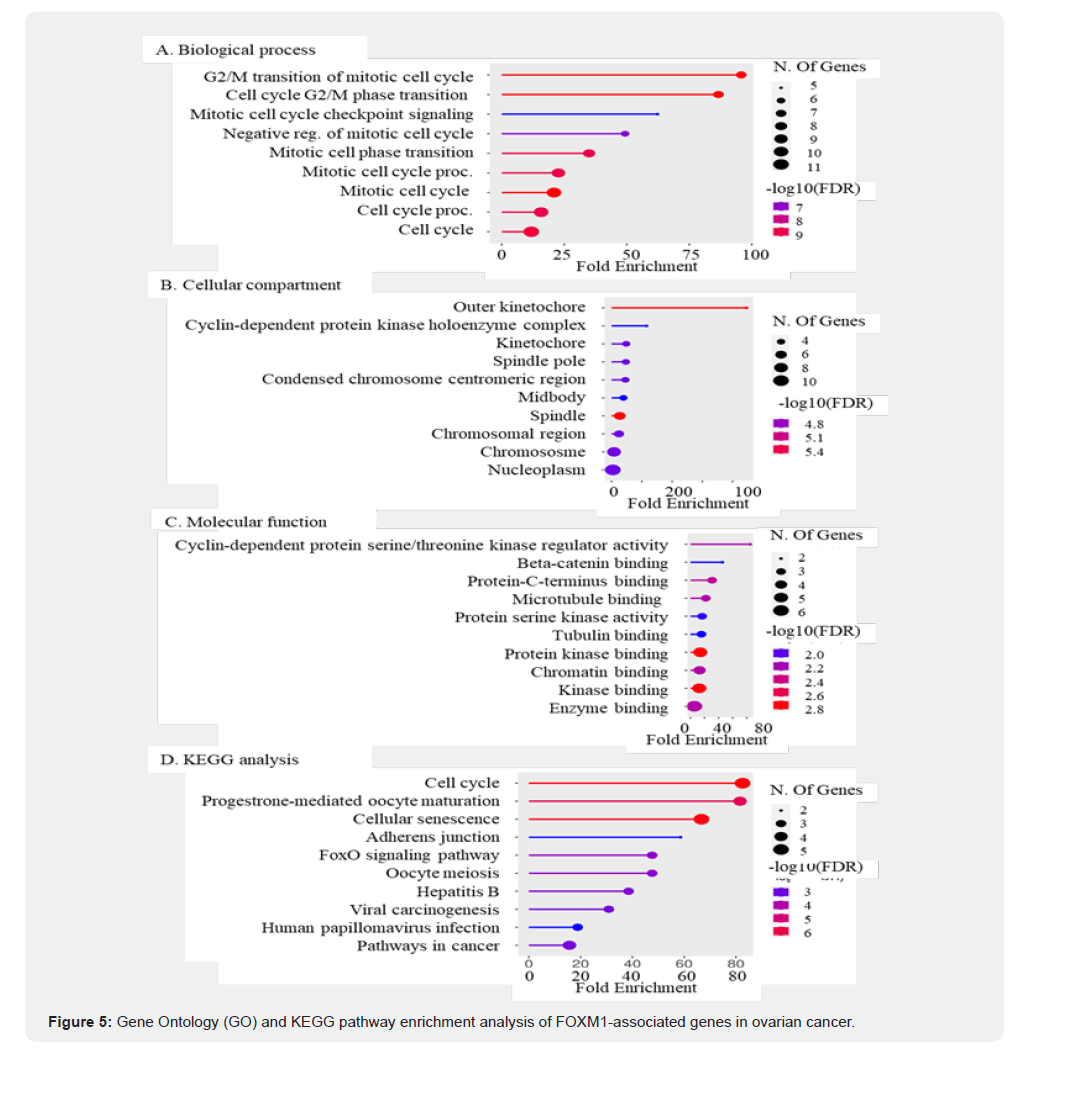 Moreover, FOXM1 interactions extend beyond traditional cell cycle regulators to include proteins such as CTNNB1 and EP300, suggesting potential crosstalk with signaling pathways such as Wnt and epigenetic regulation of gene expression. The connection between FOXM1 and BIRC5 (survivin) indicated its role in promoting cancer cell survival by inhibiting apoptosis, further confirming its importance in OC. Given these interactions and FOXM1’s overarching influence on cell proliferation and survival, targeting FOXM1 and its network partners could represent a promising therapeutic strategy for disrupting the aggressive proliferation of OC cells, positioning FOXM1 as a vital candidate for further research and clinical intervention. GO and KEGG pathway analyses of the FOXM1 PPI network in OC revealed significant enrichment in several BP, cellular components, and molecular functions relevant to cancer biology. In the BP category, FOXM1-associated genes were particularly enriched in pathways related to the G2/M transition of the mitotic cell cycle (p = 1. x 10- 10), cell cycle G2/M phase transition (p-value: 1.6 x 10-10), and mitotic cell cycle checkpoint signalling (p-value: 5.9 x 10-7). These findings indicated that FOXM1 is involved in cell cycle progression and checkpoint regulation, which are critical mechanisms in cancer proliferation and tumorigenesis (Figure 5A).