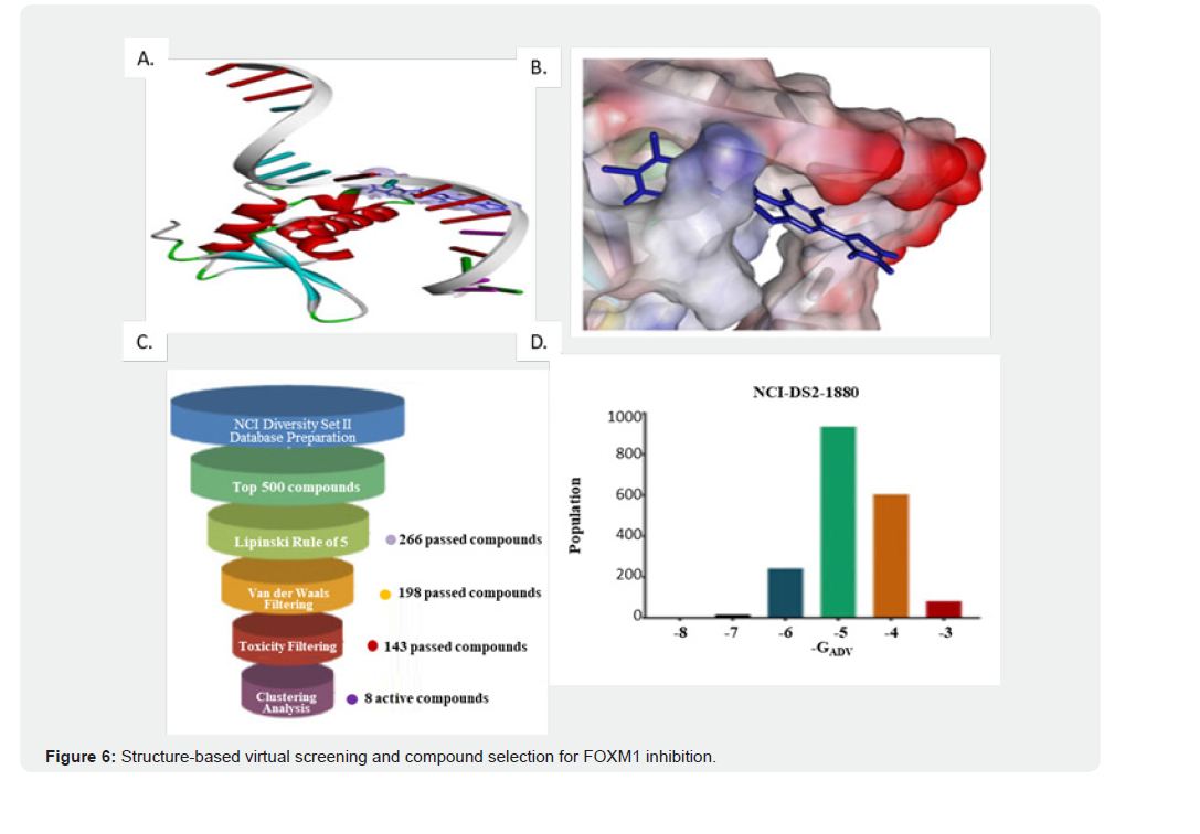 Ribbon representation of FOXM1 protein structure showing its DNA-binding domain. (B) Molecular docking visualization depicting the binding pose of a screened compound within the FOXM1 active site. (C) Workflow of virtual screening and filtering pipeline: from NCI Diversity Set II, the top 500 compounds were selected, followed by successive filtering steps including Lipinski’s Rule of Five (266 compounds), van der Waals filtering (198 compounds), toxicity filtering (143 compounds), and clustering analysis, yielding 8 candidate active compounds. (D) Distribution of docking free energy scores (ΔGADV) across screened compounds, highlighting the strong binding profile of NCI-DS2-1880. To refine the selection process and discard unsuitable candidates, a threestep filtering process was applied. First, we narrowed down to the top 500 compounds based on their binding energies and then assessed them using Lipinski’s “Rule of Five” and the Veber rule to ensure drug-like properties. Finally, we utilized the “toxicity prediction” tool in Discovery Studio (DS) to exclude compounds with potential carcinogenic, mutagenic, or teratogenic effects. This rigorous filtering resulted in a final set of 25 drug-like compounds suitable for further evaluation.