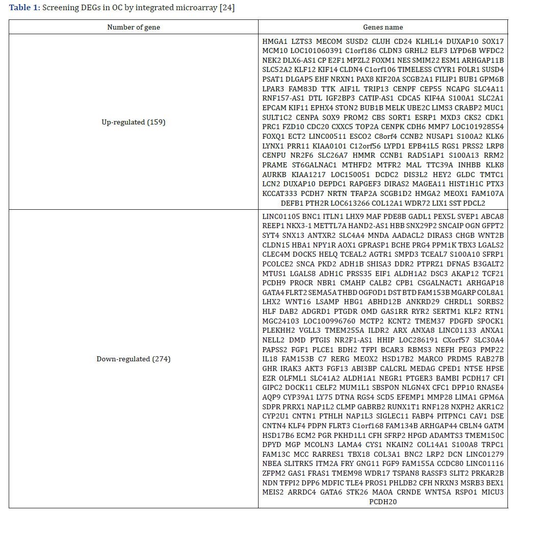 - Wei M, Bai X, Dong Q (2022) Identification of novel candidate genes and small molecule drugs in ovarian cancer by bioinformatics strategy. Transl Cancer Res 11(6): 1630-1643.