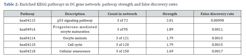 Footnote: The table lists the enriched KEGG pathways identified in the OC gene network. The “Count in network” column represents the number of genes involved in each pathway out of the total network size. “Strength” refers to the degree of enrichment, while the “False Discovery Rate” indicates the likelihood of false positives, with lower values representing higher confidence in the enrichment.