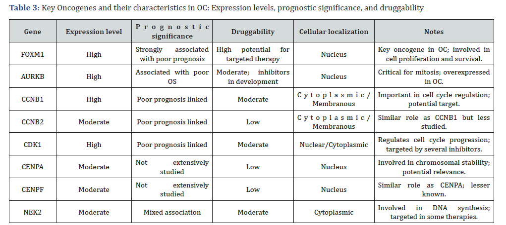 Footnote: The table summarizes critical genes involved in OC, detailing their expression levels, prognostic significance, druggability potential, and cellular localization. FOXM1, AURKB, and CCNB1 are highlighted for their strong association with poor prognosis and potential as therapeutic targets. Druggability refers to the feasibility of targeting these genes with existing or developmental therapeutic compounds.