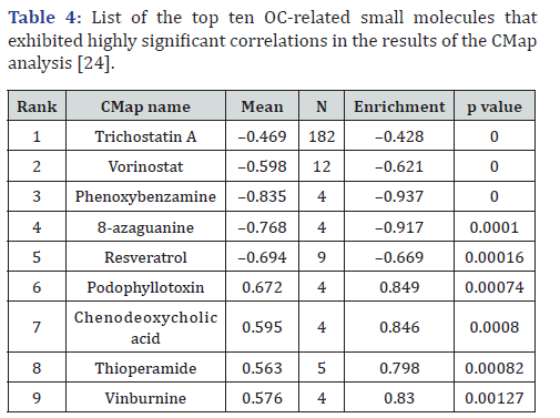 According to the p-value analysis, the top eight small molecules correlated with OC gene expression changes are listed in Table 5. Six of these molecules exhibited a negative correlation, indicating their potential tumor-inhibitory effects in clinical settings. These four molecules were positively correlated. Among those with significant negative correlations (P<0.05), trichostatin A, vorinostat, 8-azaguanine and phenoxybenzamine suggested that these compounds may suppress tumorigenic pathways. CMap analysis identified 19 small molecules significantly associated with OC (Table 4). Trichostatin A and vorinostat have emerged as the most promising therapeutic inhibitors, with highly negative enrichment scores and extremely low P-values, indicating a strong potential for clinical use. Phenoxybenzamine and 8-azaguanine also showed significant negative correlations, further supporting their relevance to the inhibition of OC-related pathways. In contrast, podophyllotoxin, chenodeoxycholic acid, and thioperamide exhibited positive enrichment scores, implying their potential roles in activating or supporting key OC biological processes. These findings suggest that these molecules hold promise for therapeutic development and as investigative tools for OC research.