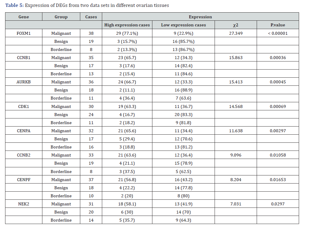 Footnote: The table shows gene expression differences (high vs. low) across malignant, benign, and borderline tumor groups. χ² tests compare expression distributions, with significant P-values (< 0.05) indicating association between gene expression and tumor type. Percentages reflect proportions within each group. Missing values (e.g., NEK2 benign/borderline) suggest data formatting gaps.