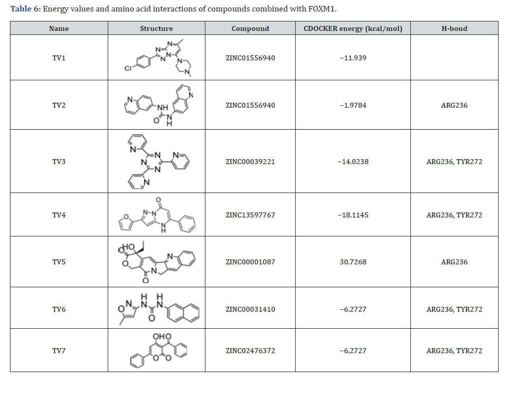 Subsequently, we conducted a comprehensive evaluation of the binding energy data, key residue interactions at binding sites, and structural diversity. From this refined library, we selected seven compounds for future in vitro biological evaluations using their DS virtual screening scores. Docking analysis identified the compound ZINC13597767 (TV4) as the most promising candidate, demonstrating the most favorable interaction with the FOXM1 target. This compound achieved the lowest CDOCKER energy of −18.1145 kcal/mol, forming stable hydrogen bonds with ARG236 and TYR272, which were crucial for its strong binding affinity. Conversely, compound ZINC00001087 (TV5) displayed a highly unfavorable interaction, characterized by a positive CDOCKER energy of 30.7268 kcal/mol, indicating poor binding and potential steric clashes. Several other compounds, such as ZINC00039221 (TV3) and ZINC00031410 (TV6), also exhibited negative CDOCKER energies, and successfully formed hydrogen bonds with ARG236 and TYR272. These results underscore the critical role of these amino acid residues in stabilizing ligand binding and highlight their significance in the design of effective FOXM1 inhibitors (Table 6).