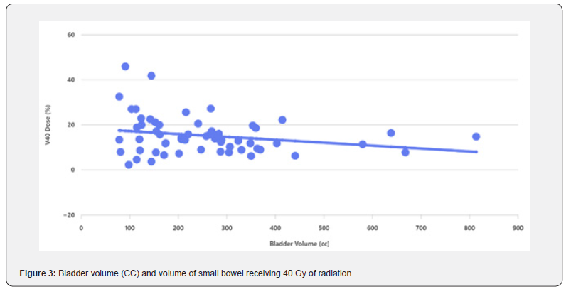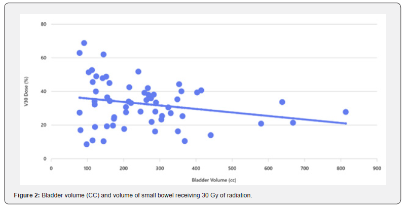 A waiver of authorization was obtained from the Institutional Review Board, and clinical data of 60 prostate cancer patients treated with radiotherapy in 2016 at our institution were retrospectively reviewed. All patients had tissue diagnoses of prostate adenocarcinoma, confirmed by cytologic or pathologic review at our institution. All cases were identified with medical record number (MRN). Data was collected using a combination of an electronic database, case notes. Radiation records were obtained for all patients from Eclipse treatment planning system (Eclipse TPS). We collected information on bladder and small bowel volumes, small bowel volume which received 20 Gy (V20), 30 Gy (V30), 40 Gy (V40) and 50 Gy (V50). The minimum dose to the PTV was 95% of the prescribed dose (7400 cGy in 32 fractions). Patients are asked to empty their bladder then drink 3 cups of water within 5 minutes. They hold this in the bladder for at least 30 minutes until the planning scan is complete. Patients who have a catheter were excluded from the study. Patients who had prostatectomy were also excluded. All patients were scanned with a full bladder on supine position. PTV and OAR including small bowel which were countered by 6 different consultant clinical oncologists to reflect day to day practice. Small bowel was contoured as bowel bag. Radiotherapy plans were generated using Intensity-Modulated Radiation Therapy (IMRT). Bladder volumes, dose volume histograms (DVHs) V20, V30, V40 and V50 for small intestine were obtained for each patient. We ran the Spearman’s rho correlation coefficient to measure the strength of the linear relationship between the bladder volume and the dose to the small bowel. we used partial correlation coefficients controlling for small bowel volume.