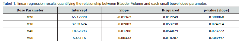 These results indicate that larger bladder volumes are associated with lower small bowel dose exposure, which aligns with clinical practice where bladder filling can help displace the small bowel out of the high-dose region. The effect is modest but more pronounced for intermediate dose levels (V30 and V40). Tabel 1 showed linear regression which confirmed a negative slope confirm that increasing bladder volume tends to reduce small bowel dose. There was a size effect, for every 1 cc increase in bladder volume. For example, V30 decreases by ~0.021% and V40 by ~0.013% which showed borderline significance (p ≈ 0.075), suggesting a trend but not strong evidence. Furthermore, R² values are low (<0.06), meaning bladder volume explains only a small fraction of dose variability.
