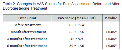 Despite the promising results, our study has several limitations. Firstly, the sample size was relatively small, with only 30 patients included. This limits the statistical power and generalizability of our findings. Secondly, our study did not include a comparison with other treatment modalities, such as NSAIDs, oral contraceptives, or GnRH agonists. This makes it difficult to definitively conclude that dydrogesterone is superior or non-inferior to other available treatments [19- 21]. We fully acknowledge these limitations inherent in this initial retrospective analysis. We have initiated a prospective randomized controlled trial (RCT) that aims to enroll a larger patient cohort and includes parallel control groups receiving NSAIDs, oral contraceptives, and GnRH agonists. We anticipate that this ongoing research will provide more robust evidence regarding the comparative efficacy of dydrogesterone.
