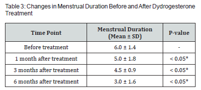 All 30 patients completed the study. The baseline characteristics of the patients are summarized in (Table 1). The mean age of the patients was 32 years (range 18-50 years), with an average menstrual duration of 5.0 days (range 5-8 days). The average number of pregnancies was 3 (range 0-5), and the average number of deliveries was 1 (range 0-2). Pain Assessment Using Visual Analog Scale (VAS) (Table 2) ,Pretreatment, the severity of dysmenorrhea was categorized as follows: 9 patients had mild dysmenorrhea (VAS score 1-3), 17 had moderate dysmenorrhea (VAS score 4-6), and 4 had severe dysmenorrhea (VAS score 7-10). The mean VAS score before treatment was 85 ± 15.4, indicating a high level of pain intensity among the study population. After initiating dydrogesterone treatment, there was a significant reduction in VAS scores across all time points. Specifically, the mean VAS score decreased to 66 ± 12.6 after 1 month (P < 0.05), to 45 ± 9.9 after 3 months (P < 0.05), and to 39 ± 12.6 after 6 months (P < 0.05). This progressive reduction in VAS scores indicates a substantial alleviation of pain symptoms over the treatment period. In addition to pain relief, the treatment also resulted in a significant reduction in menstrual duration (Table 3). The mean menstrual duration before treatment was 6.0 ± 1.4 days. After treatment, the mean menstrual duration decreased to 5.0 ± 1.8 days after 1 month (P < 0.05), to 4.5 ± 0.9 days after 3 months (P < 0.05), and to 3.0 ± 1.6 days after 6 months (P < 0.05). Regarding safety and tolerability, no cases of amenorrhea were reported by any of the 30 patients at the 6-month follow-up. This aligns with the progestogenic mechanism of dydrogesterone, which generally preserves the menstrual cycle. Therefore, we have not described it in the table.