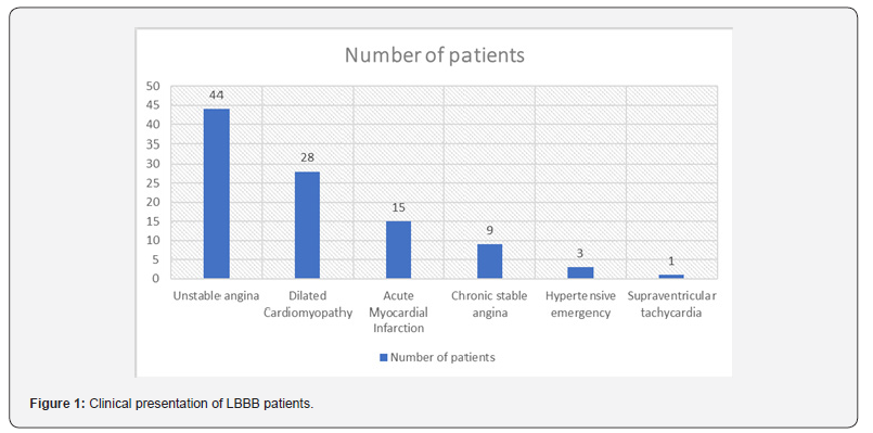 Among current study group, most common presenting complaint was chest pain (85%) and breathlessness (85%). Syncope was noted in 4 patients (4%) and palpitations in 13 patients (13%). Bharath et al. study group had dyspnea in 41 patients (35.34%), chest pain in 37 patients (31.89%), syncope in 11 patients (10.54%), palpitations in 3-patients (2.58%) and asymptomatic in 24 patients (20.68%) [28]. Asymptomatic LBBB patients were not included in this study group. Yousif S et al. study group of 150-patients had chest pain in 96 patients (64%) and dyspnea in 41 patients (27.3%) [30].