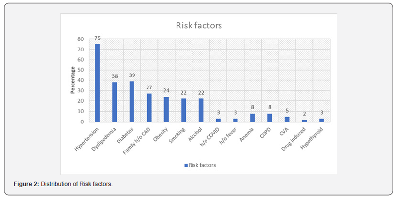 Results: Majority of them presented with chest pain (85%) and breathlessness (85%). Out of them 15 patients had acute myocardial infarction