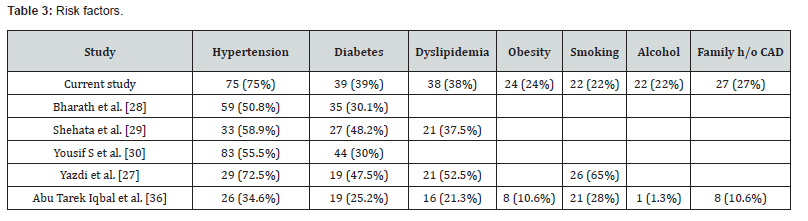 Left anterior descending artery was most affected vessel (31 patients out of 41 patients with significant CAD, 76%), followed by right coronary artery in 14 patients (36%) and left circumflex artery in 10 patients (24%). Significant CAD was noted in 41 patients (41%), non-significant CAD in 37 patients (37%) and normal coronaries in 22 patients (22%). Abu Tareq Iqbal et al. [36] study group had higher percentage of normal coronaries (64%) compared to current study group (22%) [36]. This could be because of lesser comorbidity burden in their group. They had DM in 19 patients (25%), dyslipedemia in 16 patients (21.33%), obesity in 8 patients (10.6%) and hypertension in 26 patients (34.66%) as against 39 patients (39%), 38 patients (38%), 24 patients (24%) and 75 patients (75%) in current study group [36].