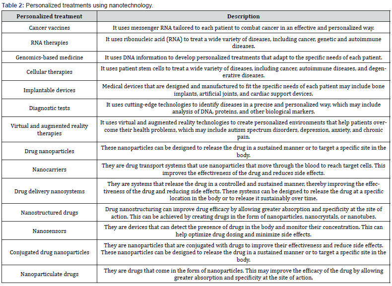 These advances have the potential to revolutionize the field of medicine and improve the quality of life of millions of people around the world [12]. Future research could focus on the development of more efficient and specific biosensors that can detect a broader range of biomarkers, as well as the use of nanoparticles in the treatment of other diseases [13]. Table 1 shows some potential treatments that combine nanotechnology and pharmacology. Some of these treatments are still in the experimental stages and more research is needed to fully understand their safety and effectiveness. As a complement to the above, recently, new forms of nanoparticle structures densely modified with small fragments of DNA or RNA have been developed, which interact with living systems in ways never observed [14-17]. These structures, known as spherical nucleic acids, have the potential to revolutionize genetic medicine and gene therapy. The CRISPR-Cas9 biological gene editing nanomachine has been identified [18,19] isolated and reconstituted as drugs, enabling rapid development for a variety of different targets. These nanomedical tools have a high modularity that allows them to be adapted to different needs and objectives, opening new possibilities for the treatment of a wide range of diseases [20]. The ability of these spherical nucleic acid structures to access and penetrate tissues is one of their main advantages, as it makes it easier to be used as new and powerful genetic medicines. Furthermore, its interaction with living systems allows greater efficiency and precision in genetic editing, reducing the incidence of side effects and improving the effectiveness of treatment. To conclude this section, it is important to evaluate the safety and toxicity of nanomaterials used in diagnosis and treatment to ensure that they do not cause any harm to patients [21,22]. By continuing to explore the potential of nanotechnology in medicine, researchers can help improve the health status of people regardless of their economic status.
